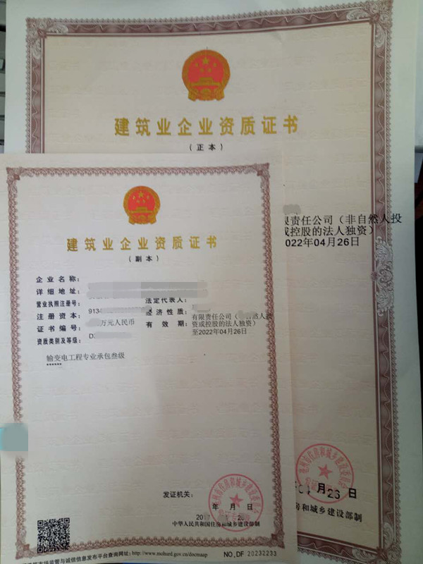 建筑工程施工总承包、市政公用工程施工总承包、公路工程施工总承包、电力工程施工总承包、机电工程施工总承包、水利水电工程施工总承包、通信工程施工总承包等各种企业资质(包括总承包、专业承包等系列)及安全生产许可证。