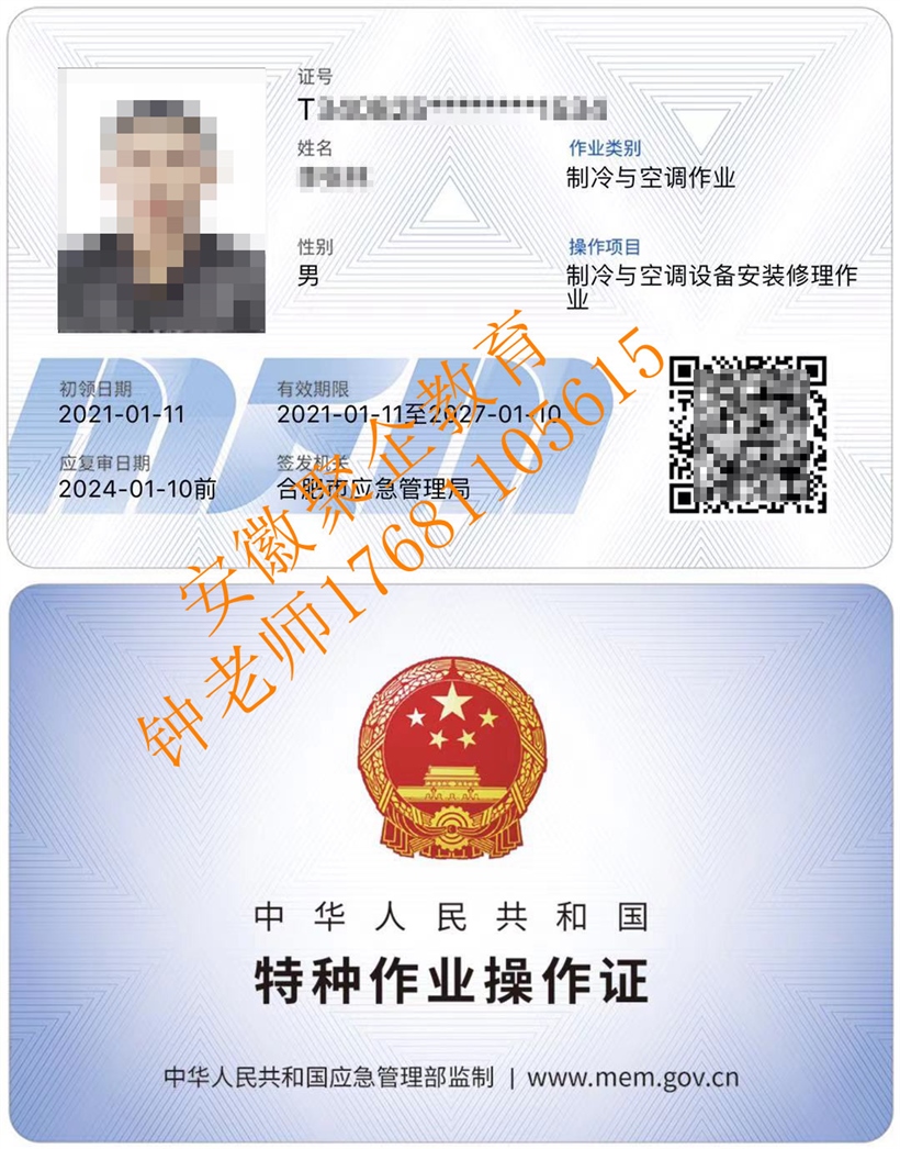 ①应急管理局(原安监局)特种作业操作证(制冷工操作证即上岗证)
