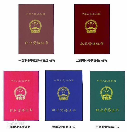 我国职业资格证书分为五个等级:初级(五级)、中级(四级)、高级(三级)、技师(二级)和高级技师(一级)。